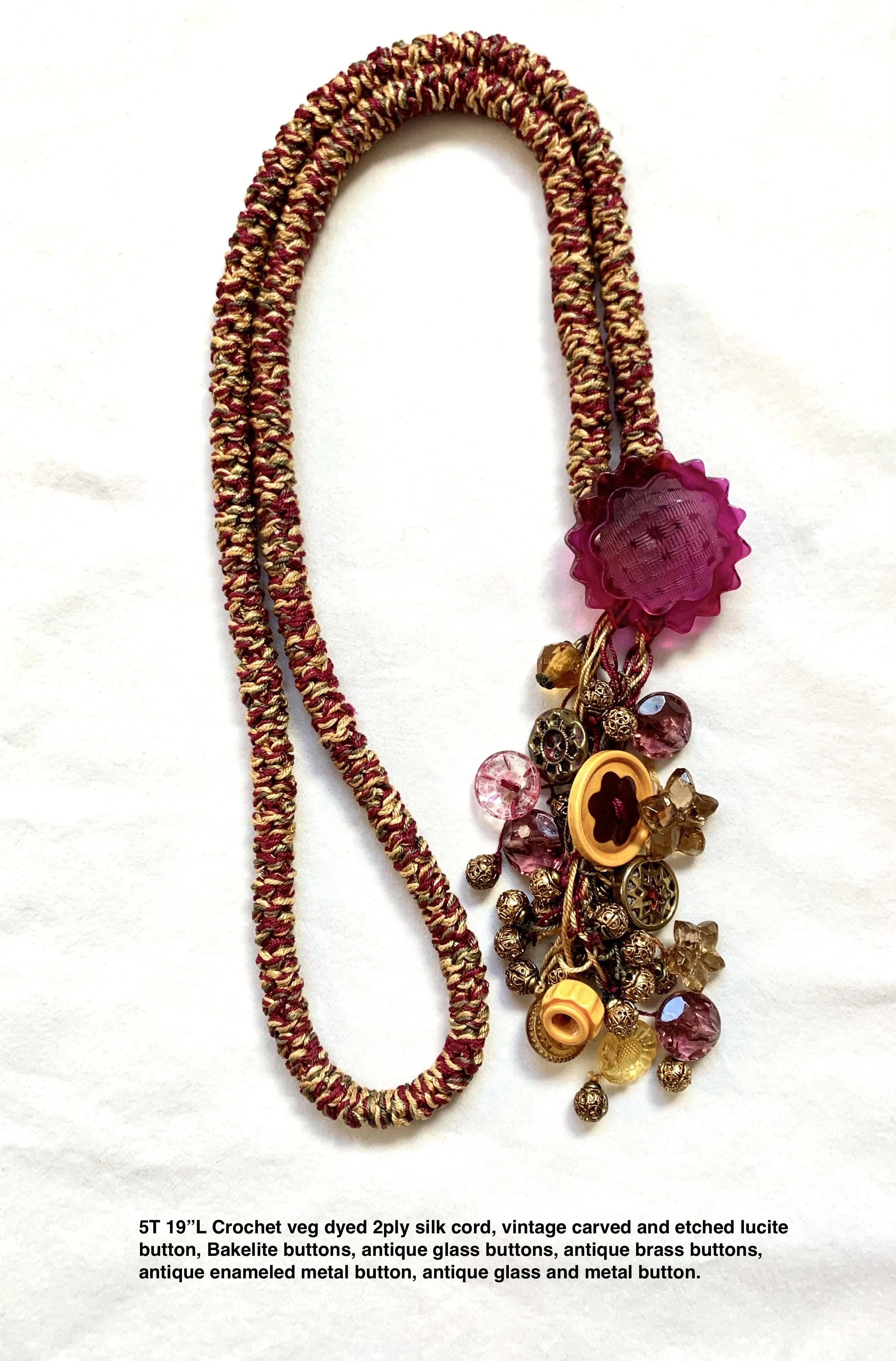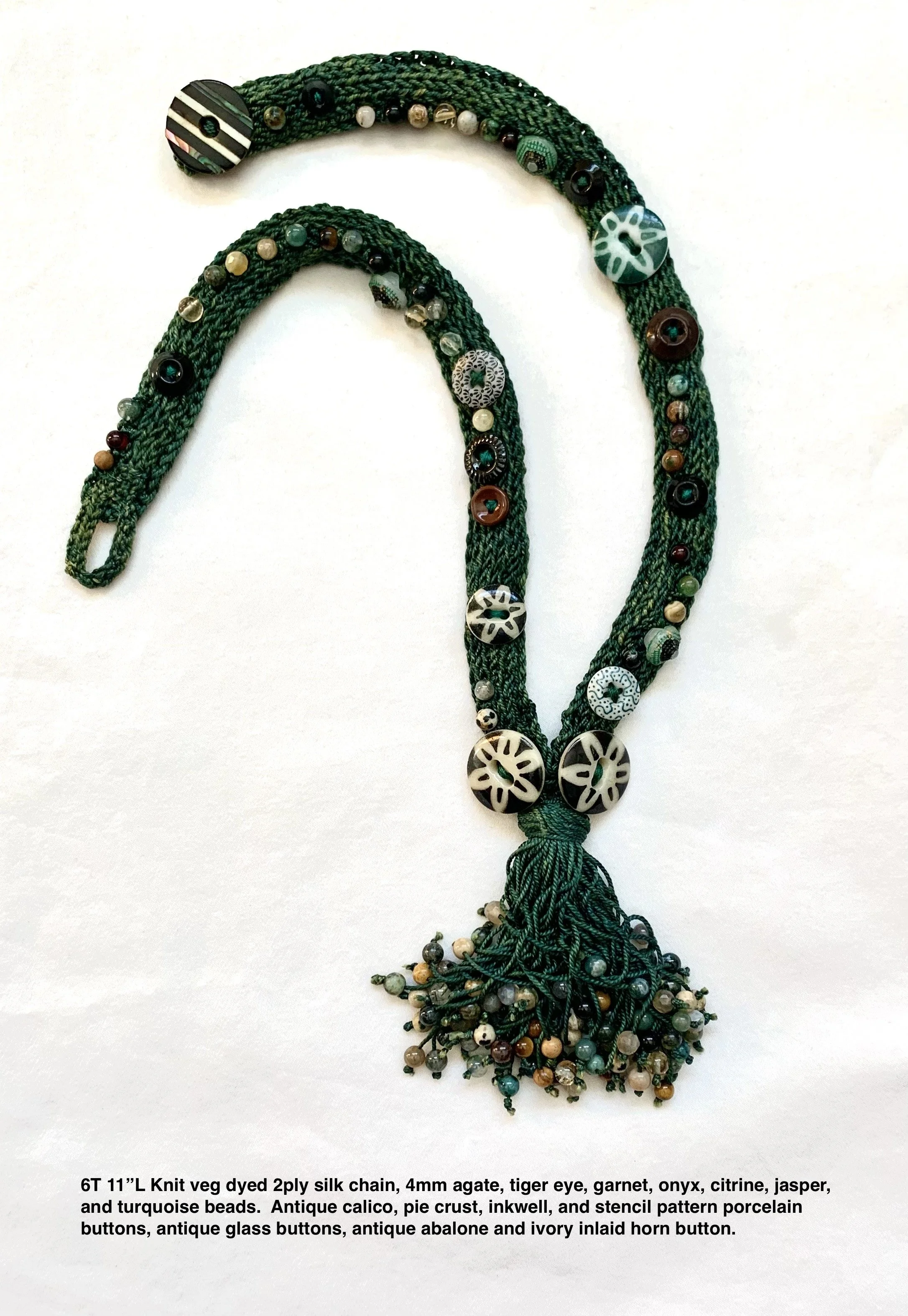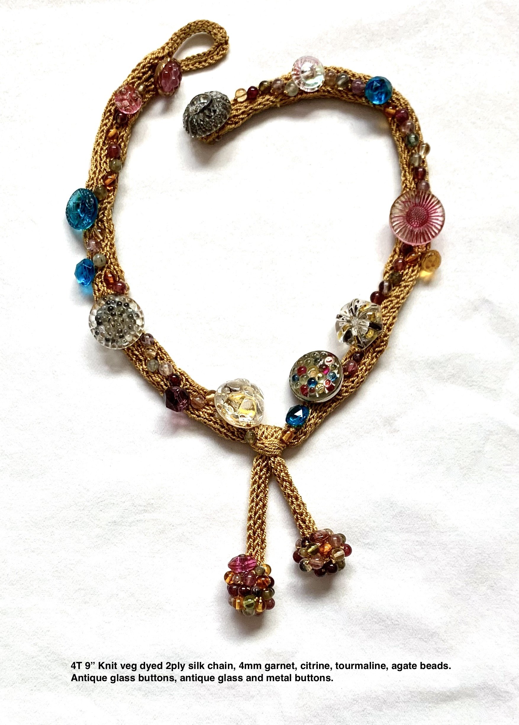Barbara knits vegetal dyed 2ply silk chains and crochets vegetal dyed 2ply silk flat chains and round cords, and constructs beaded and bauble tassels made of precious and semiprecious beads, antique and vintage buttons, and shells. Inquire (908) 591-0359