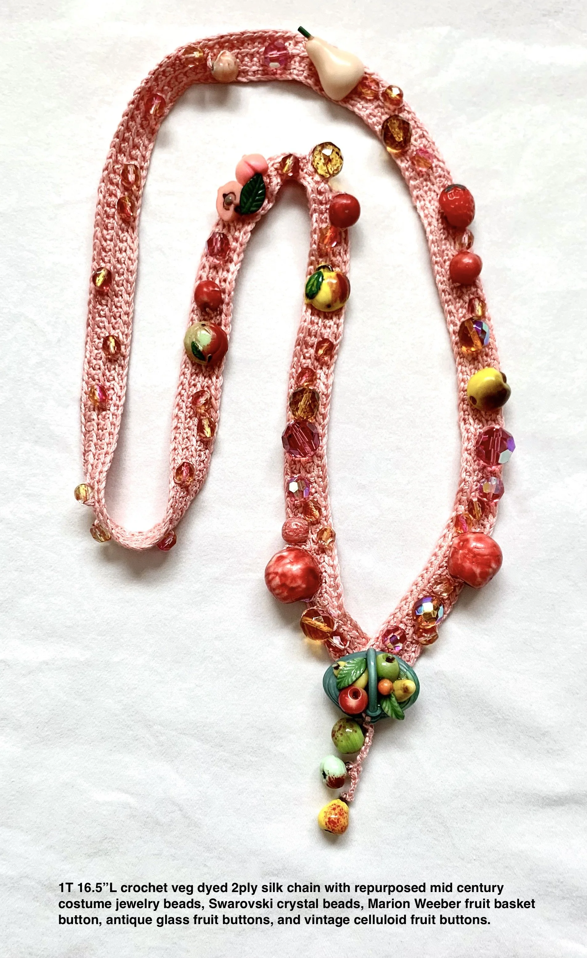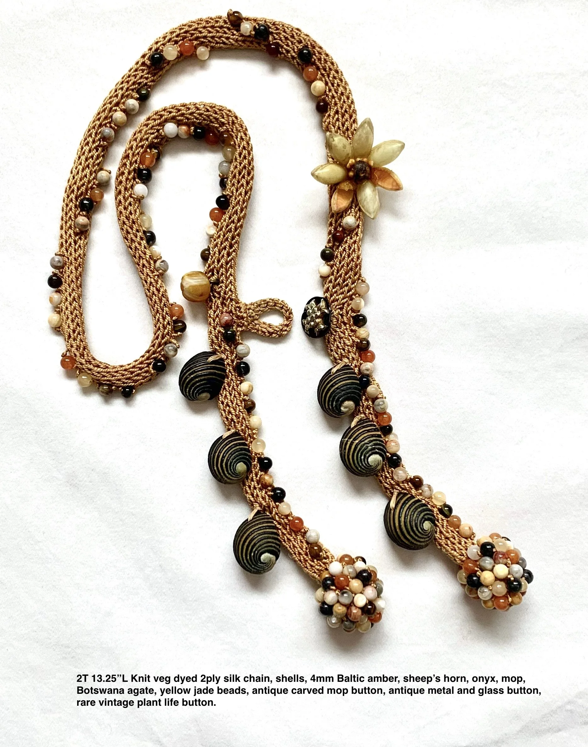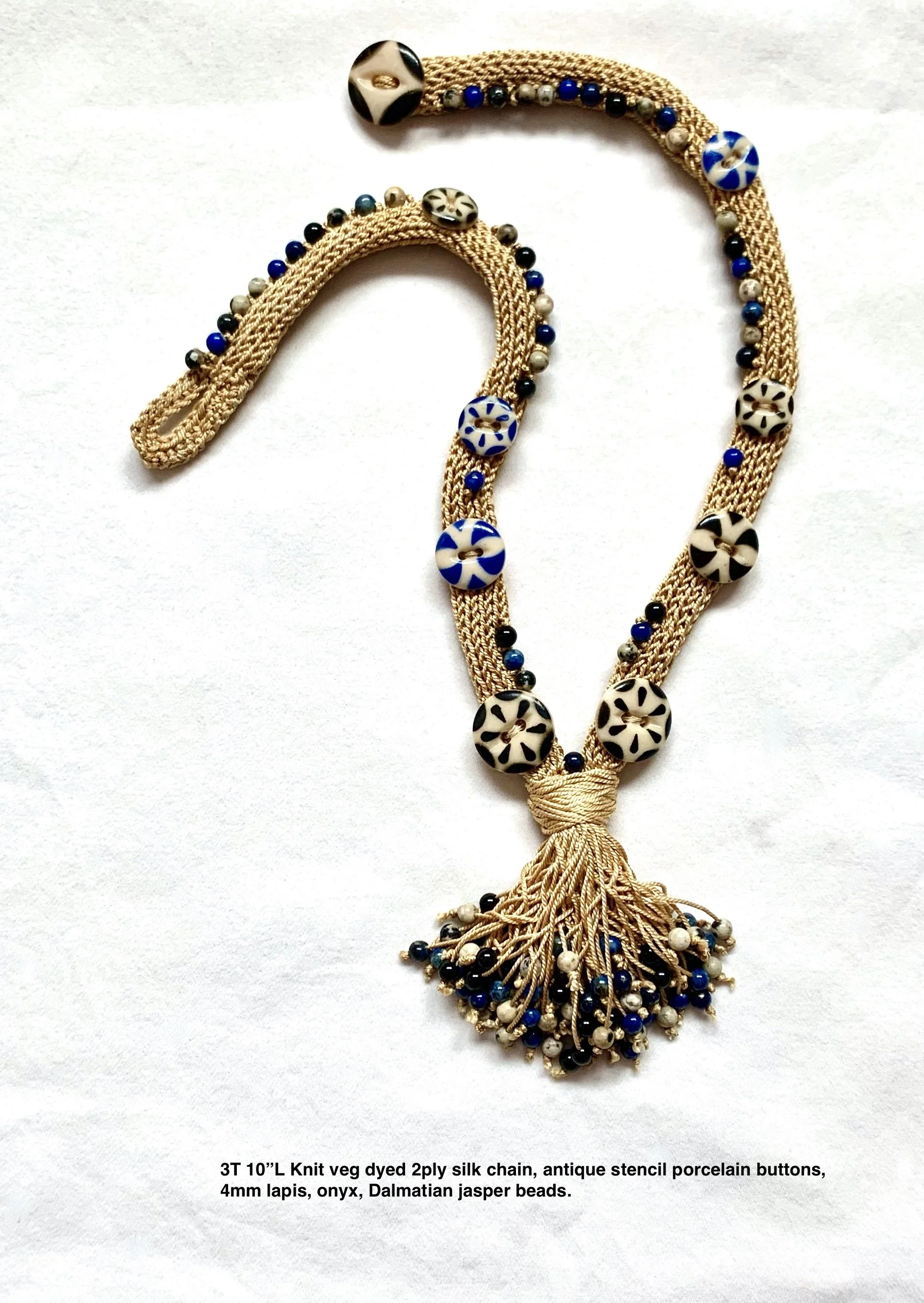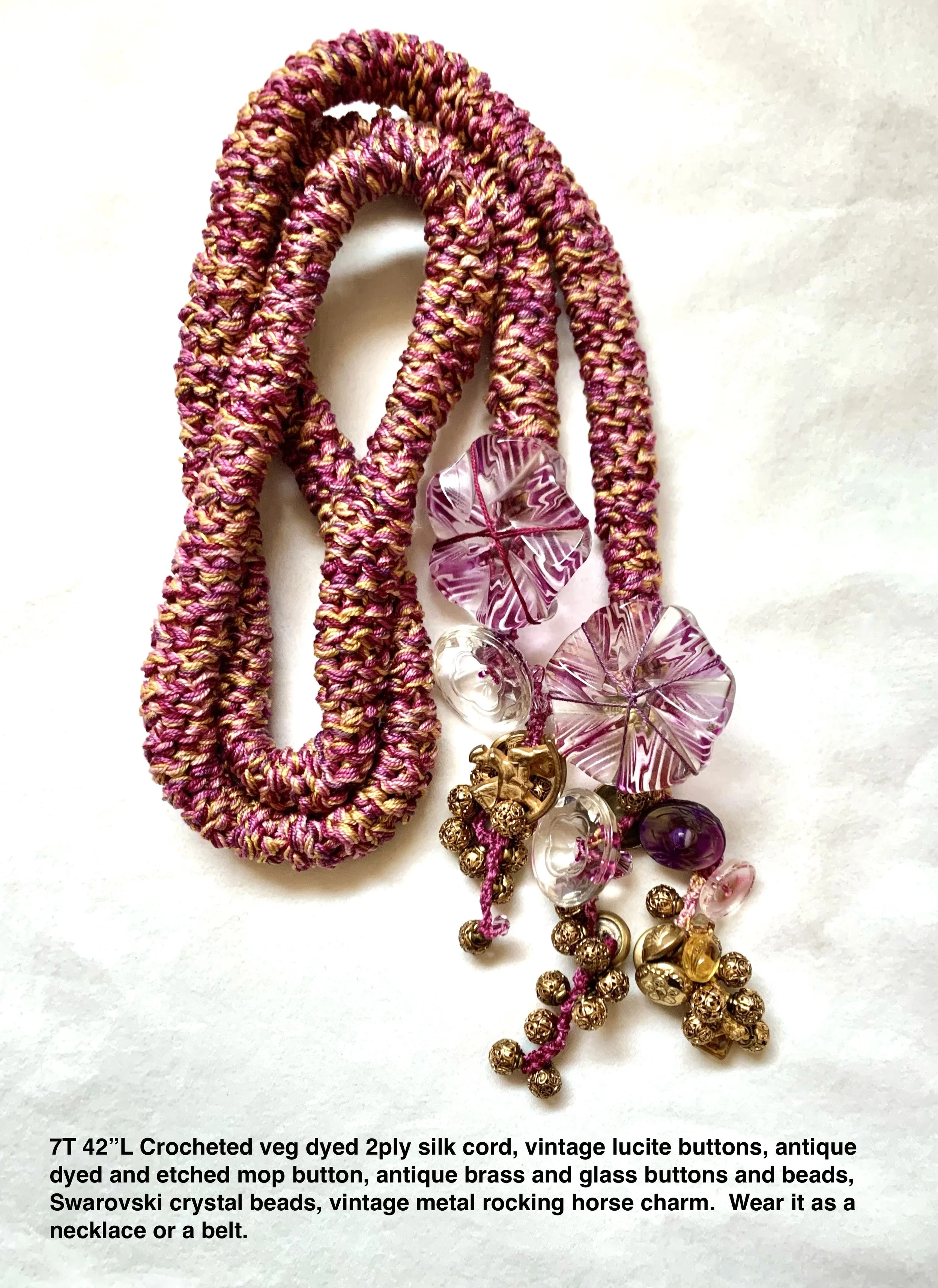 Barbara knits vegetal dyed 2ply silk chains and crochets vegetal dyed 2ply silk flat chains and round cords, and constructs beaded and bauble tassels made of precious and semiprecious beads, antique and vintage buttons, and shells. Inquire (908) 591-0359